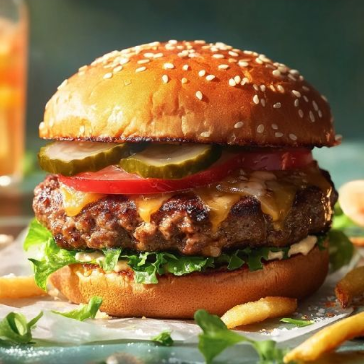Juicy beef patty burger served with fresh vegetables and sauce.